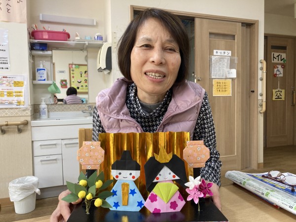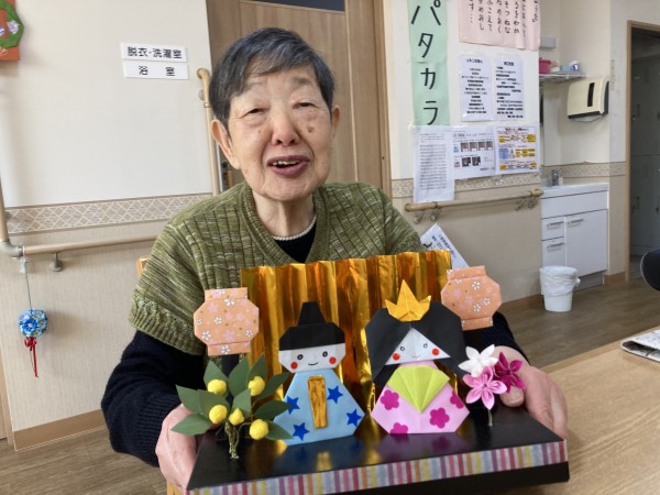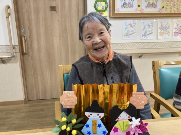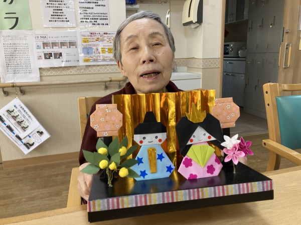 職員とご入居者様手作りのお雛様と一緒に写真を撮りました。
