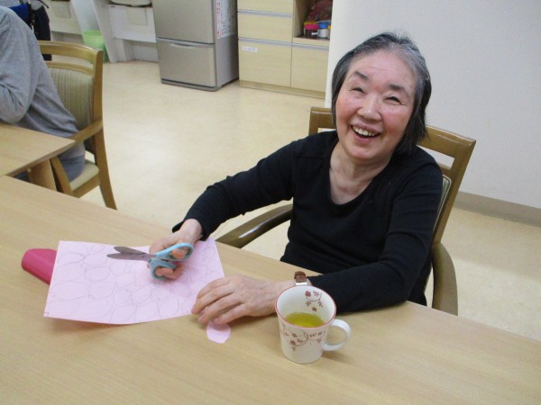 ご利用者様に桜の花びらを切っていただいています。 (笑顔が素敵!)