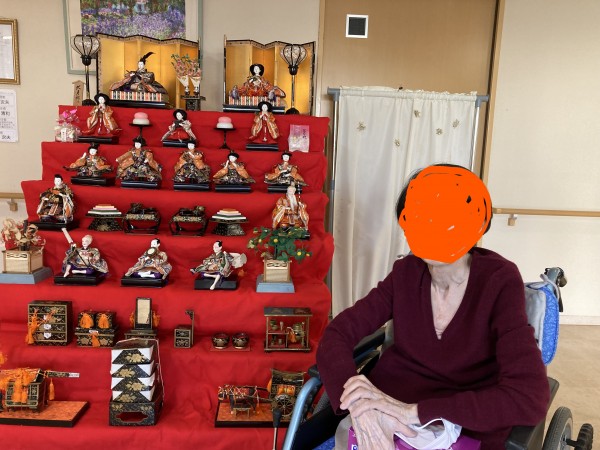 1階入り口に大きなお雛様と一緒に写真を撮り
