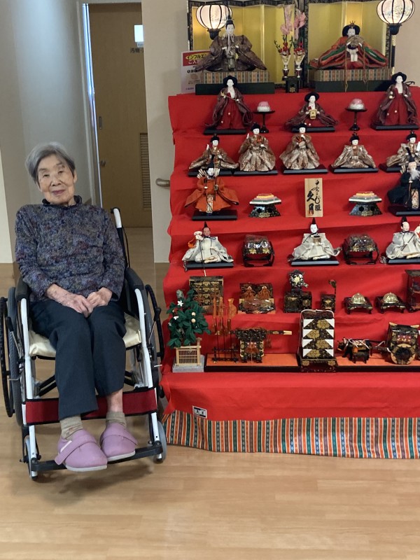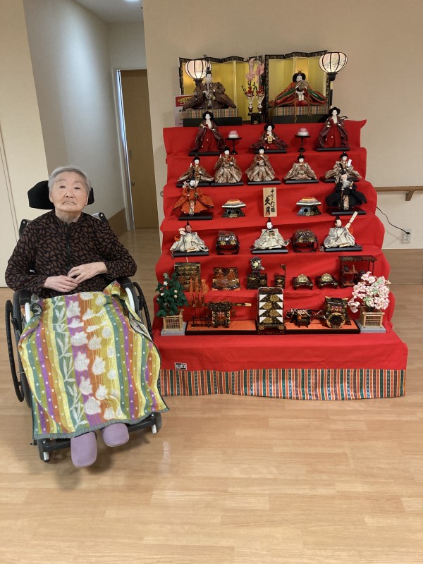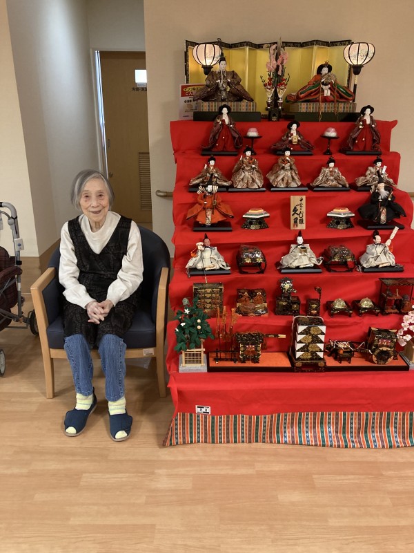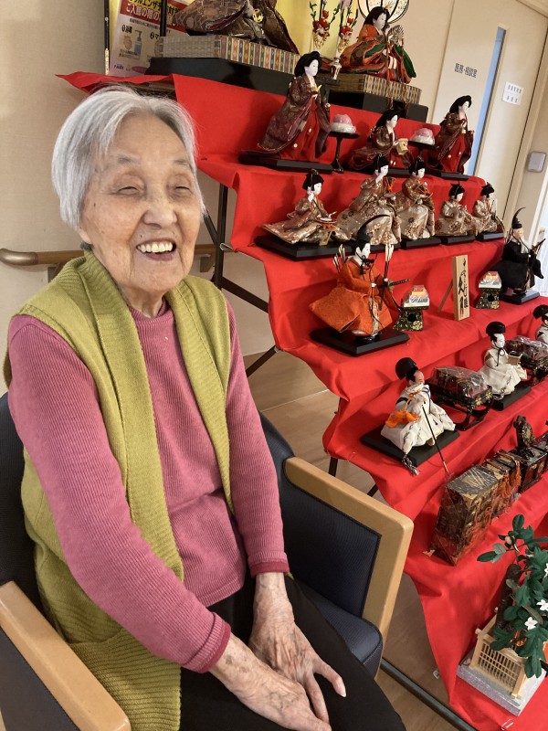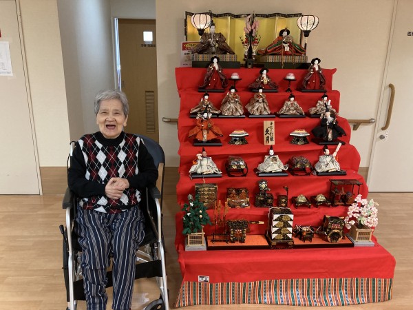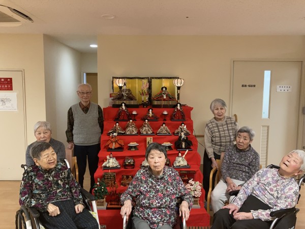 グループホームみんなの家西東京では、施設内のエントランスの他にもエレベーターホールに8段飾りのひな壇を飾ってあります。雛人形を鑑賞して頂き後に記念撮影をしました♪皆様の柔らかい笑顔がとても印象的でした!