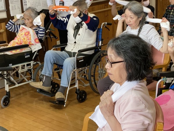 毎月行われるリズム体操ですが、今回はリモートで、各施設と繋がりながら【タオル体操】を行いました。