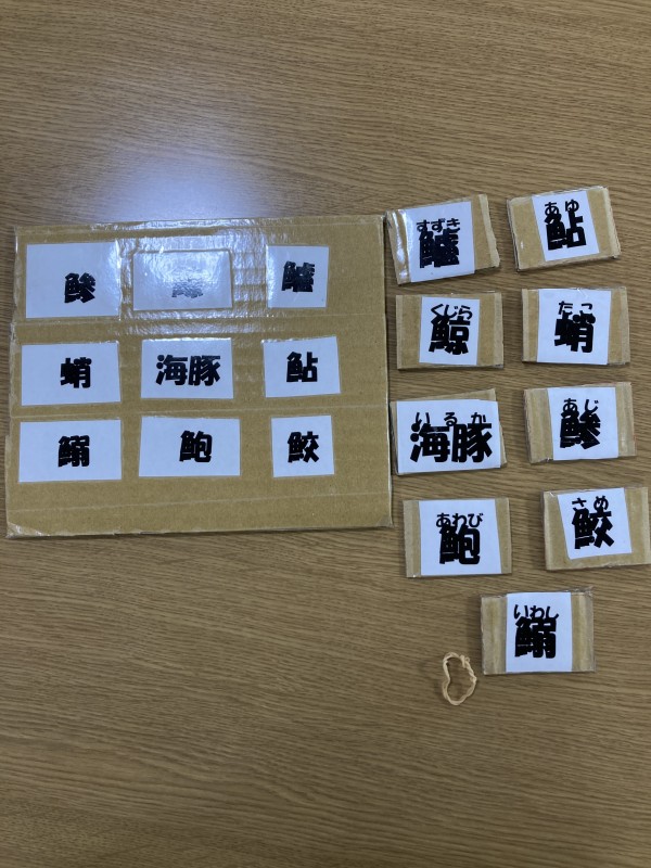 こちらが、スタッフ自作のジグソーパズル。題して「魚漢字ジグゾーパズル」!まだ試作品の為、ところどころ切り口が汚いですがこれから改善していく予定です(汗