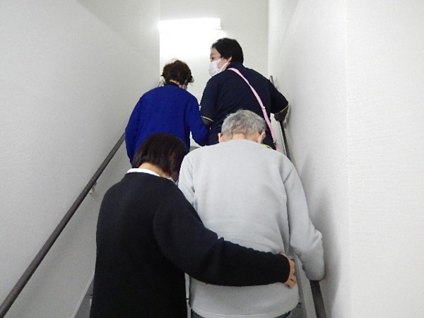 ご利用者さまにも上階への避難誘導にご協力していただき、頑張って階段を登ってくれましたぁ(;^_^A