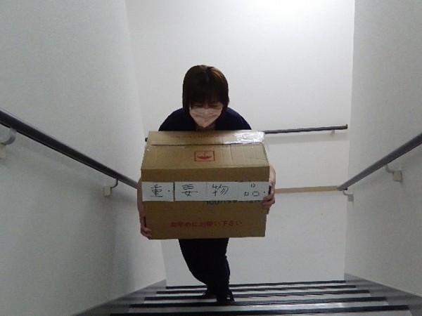 重い段ボールをスタッフが頑張って運びます‼