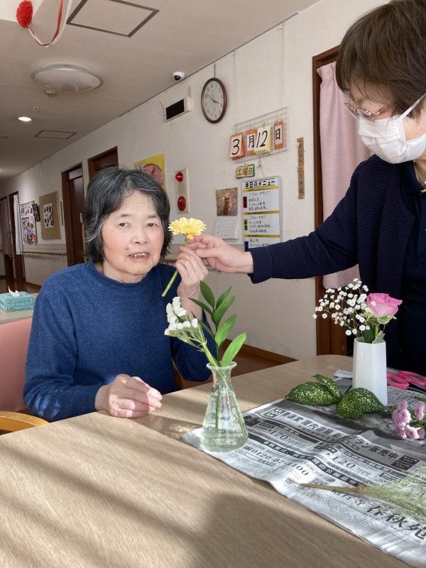 ご自宅で過ごされていた時もお花の手入れが大好きだった利用者様がホームでも生けたりすることができるようにスタッフがお花を用意してみました。