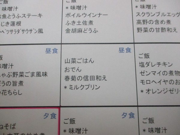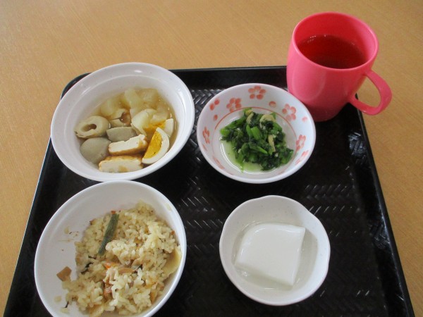 山菜ごはん、おでん、春菊の信田和え 、そしてデザートはミルクプリンです。美味しそう!!