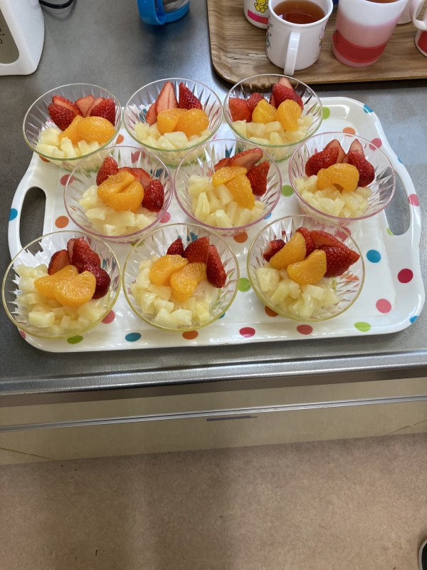 今日は特別おやつのプリンアラモード♪プリンが隠れちゃっていますが…(汗