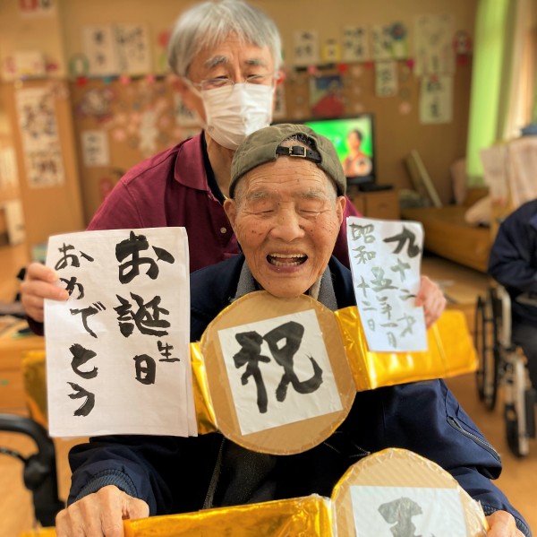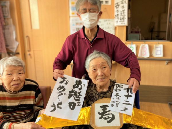 ☆☆大きな金ベルトに書道がお上手なご利用者様が【祝】書いて頂きました☆☆
