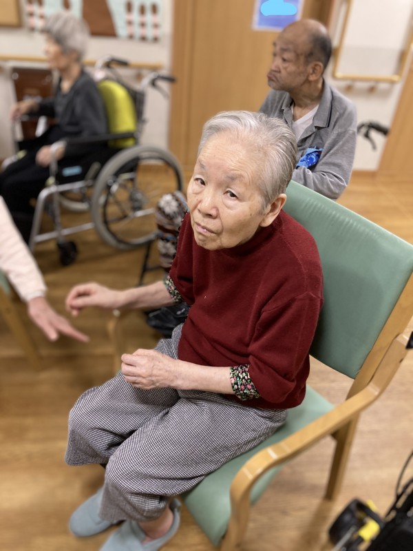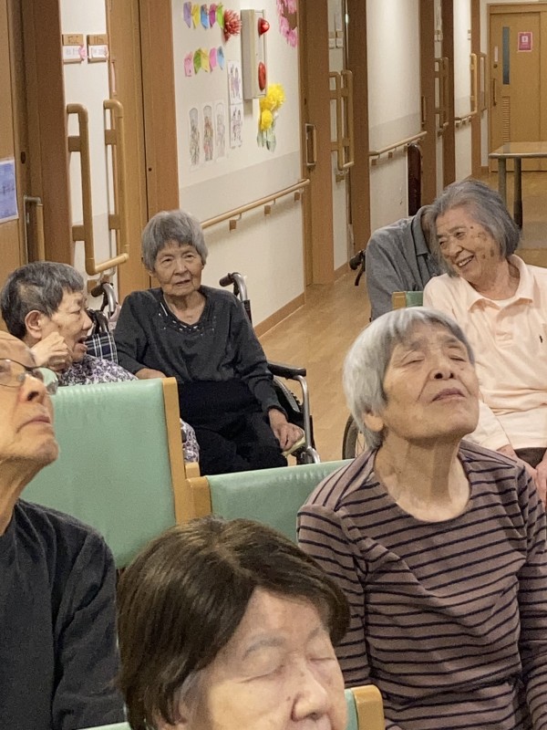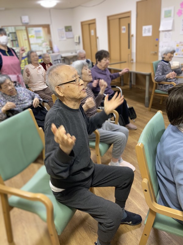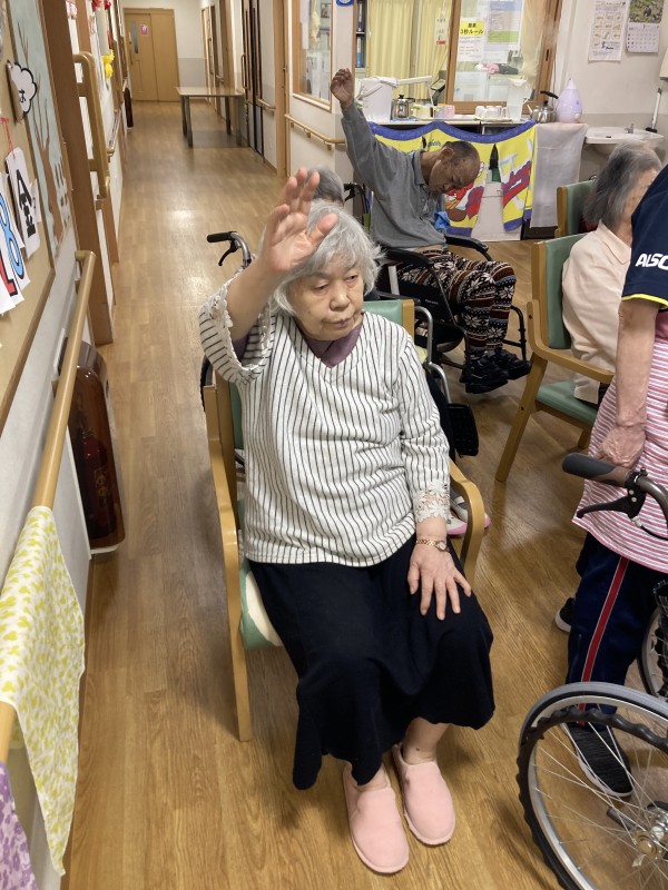 この体操イベントのもうひとつの特長は、①当ホームの1Fと2Fのみなさんが合同で参加されること、に加え、②リモートでALSOK介護の他の施設のみなさんと一緒にお互いの様子を感じながら体操できること、すなわち社会参加にあります。