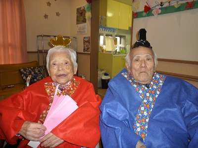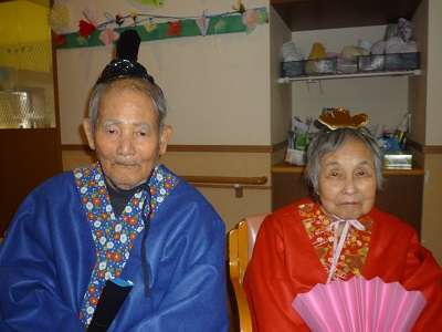 ![]() スタッフ手作りの衣装をまとい、ちょっと緊張の表情。 | ![]() やはり女性の方がリラックスした表情かも・・・ |