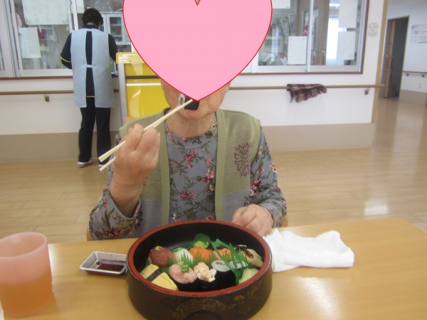施設では、あまり食べれない特別にショートケーキと握り寿司が提供されました。