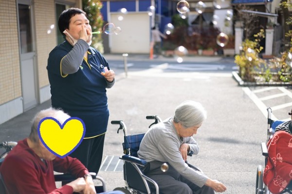 施設内、食堂の窓越しからも参加された利用者さまにもキレイなシャボン玉を見ていただき、とても喜んでいただきましたぁ(*'▽')