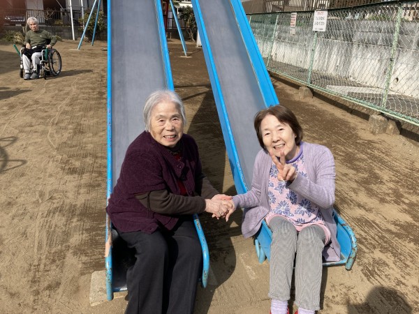 昔懐かしの滑り台に座って(さすがに滑るのは止めさせてもらいました…)、童心に戻りハイチーズ♩