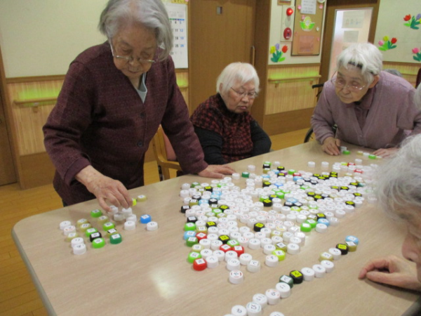 ・ペットボトルのキャップにひらがな50音(濁音等も全部ですが、、、)のシールを貼り、スタッフがお題を発表!!