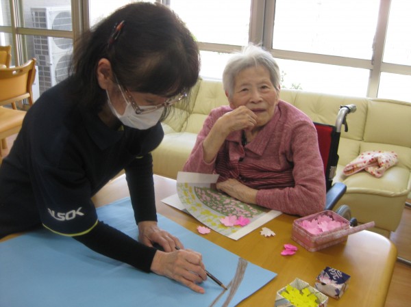 こんにちは!グループホームみんなの家・あきがせの介護ブログです!よろしくお願いいたします。中々お外にいけないので菜の花と桜の貼りを行いました( ^ω^)・・・ みんなで楽しく貼ることができました!!