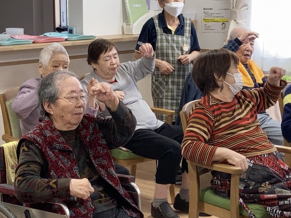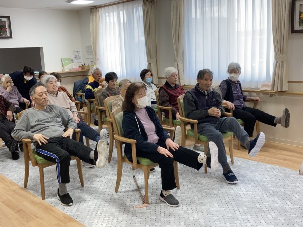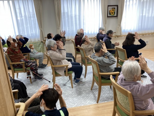 高橋先生による、訪問ノーア。目の前で、直接先生に声をかけられ、ちょっと緊張気味ですが、音楽がかかると、リズムに乗って、楽しく身体を動かします。職員も先生に指名され、「あれ?こうだっけ、、」と先生に確認しながら頑張ります。リモートとは違った雰囲気で、皆さん頑張りました。