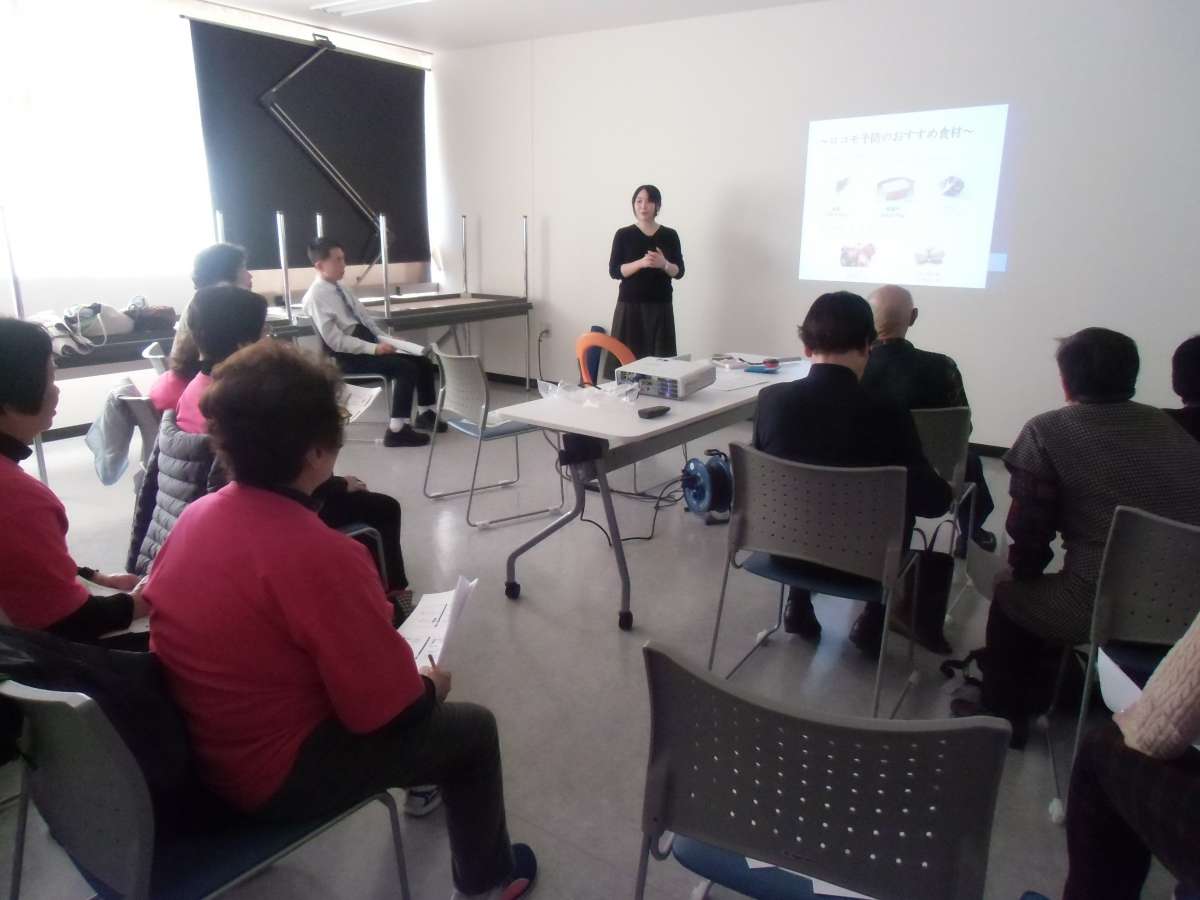 今回のミニ講座は、『長生きを支える足腰作り』~ロコモティブシンドローム(運動器症候群)の予防法~を行いました。カイエー薬局グループの管理栄養士さんから、骨を丈夫にする食べ物、筋肉をつくる良質なたんぱく質の話に、皆様、メモを取りながらに熱心に聞かれていました。