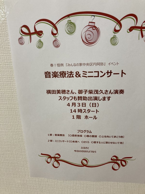 毎月1回以上大きなイベントを開催していますが、来月の大規模イベントの予定として職員によるコンサートを予定しています。趣味で音楽を行っている職員が数人集まり本格的な歌と演奏を皆様にお楽しみいただきます。