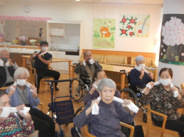 時には頭上に投げたり、足の下をくぐらせたりと、タオルを縦横無尽に使い切り、健康のための体作りに取り組まれています。