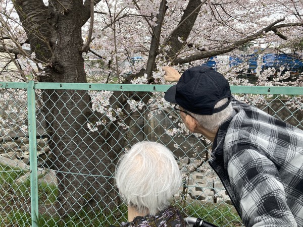 見事なサクラに指を差し、久しぶりの外出 気分最高。