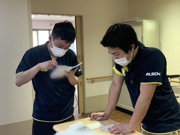 後輩の門田ケアスタッフと情報共有します。