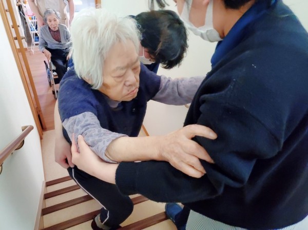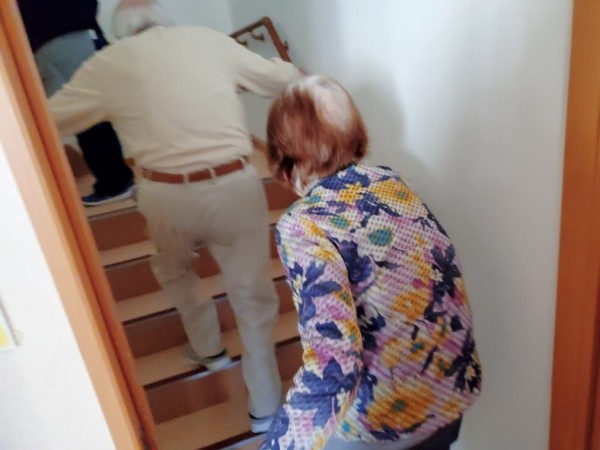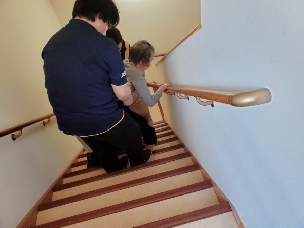 利用者様の現ADLに合わせて職員の介助方法も変え、一緒に階段を登りました。