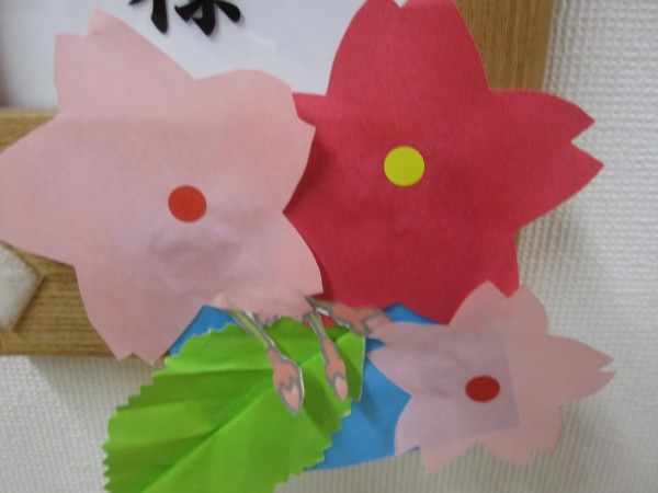 赤色やピンク色の折り紙で桜を作成しました\(^o^)