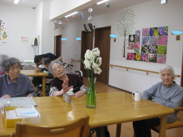 こんにちは!グループホームみんなの家・あきがせの介護ブログです!よろしくお願いいたします。オーナー様から水仙の花いただきました!! 早速花瓶に飾り鑑賞しました( ^ω^)・・・
