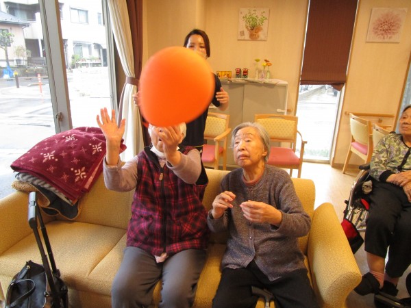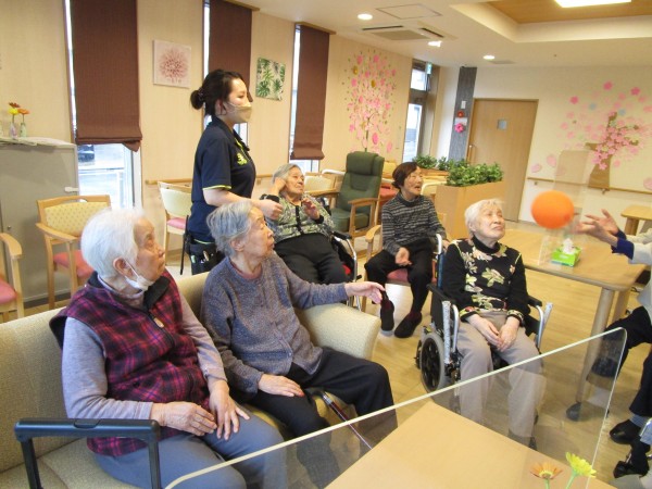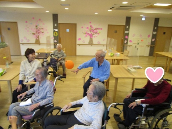 本日、新しくご入居されたご利用者さまを早速お誘いし、みんなで“風船バレー”を行いましたぁ(^_-)-☆
