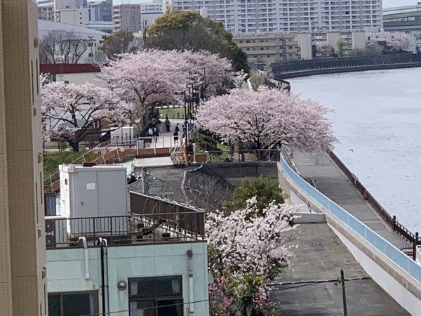 ベランダから、あらかわ遊園地の桜が見えます。