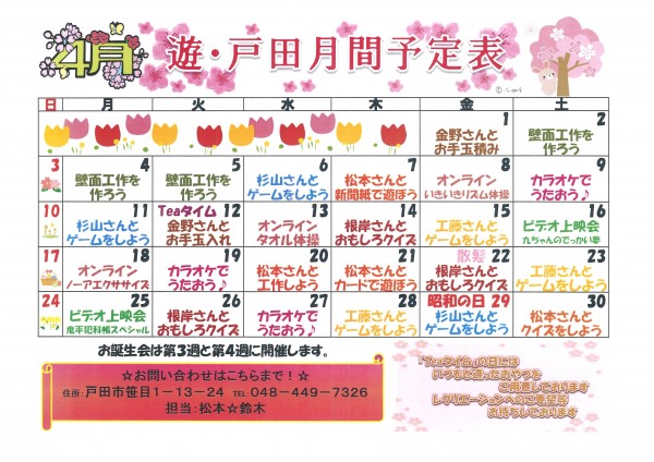 さて、今回は4月のレクリエーションカレンダーを紹介いたします。