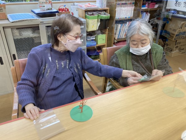 ご利用者様皆さん、ご自身で作った満開の桜のオブジェに、とても素晴らしい笑顔を見せていただきました。