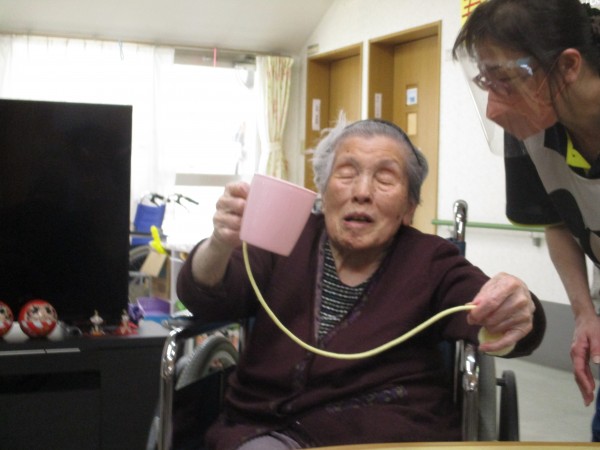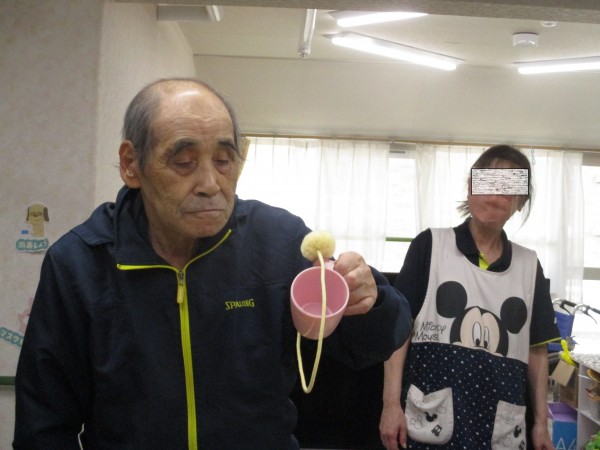 コップに紐とボールを結わえ、けん玉に見立ててみました!