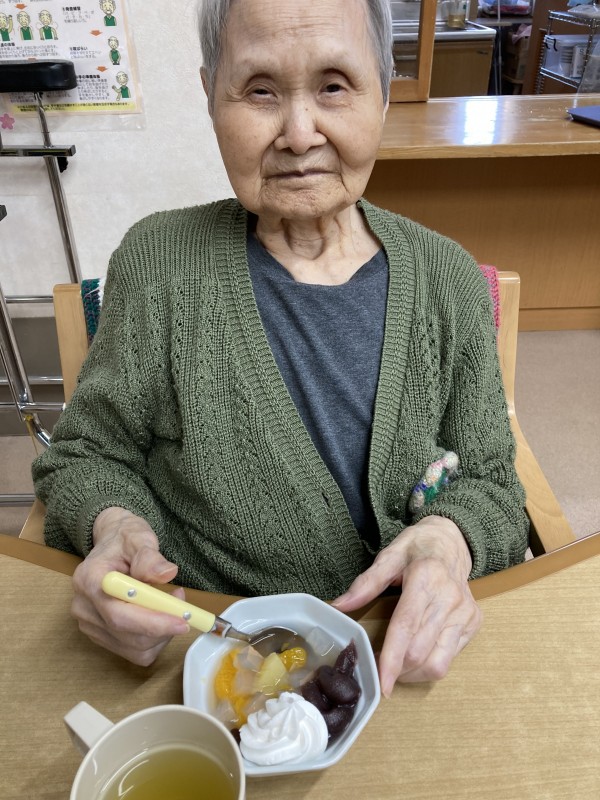 今日はおやつにあんみつをお出ししました。