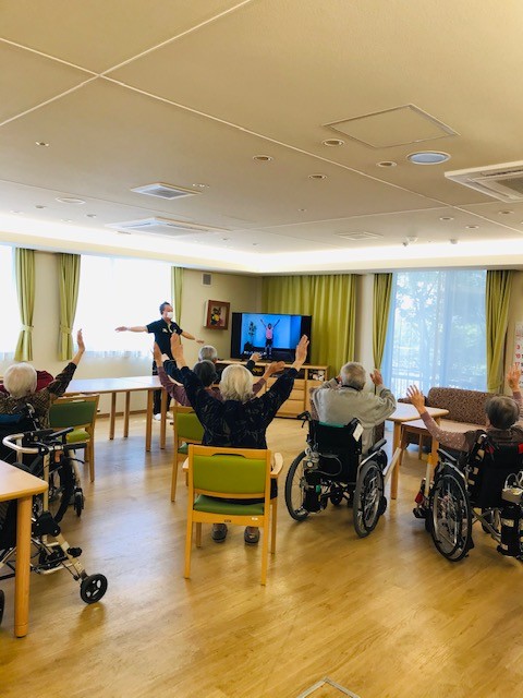 スタッフ一人を体操を促す係として配置しスタッフも一緒に体操。。。
