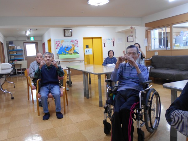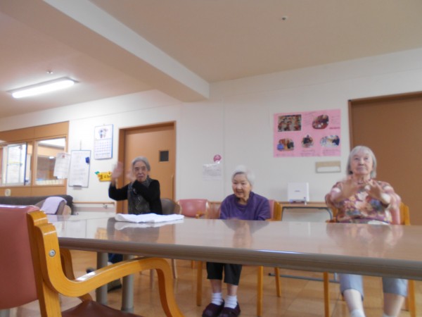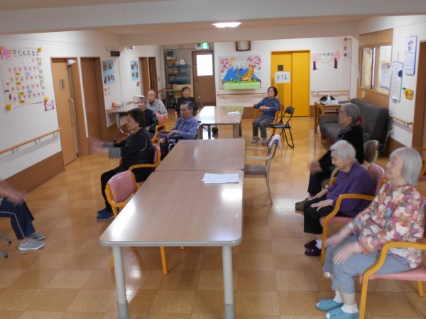 午後はSMAPの「世界に一つだけの花」と中村美津子の「河内おとこ節」の音楽に合わせて手や足を動かしています。