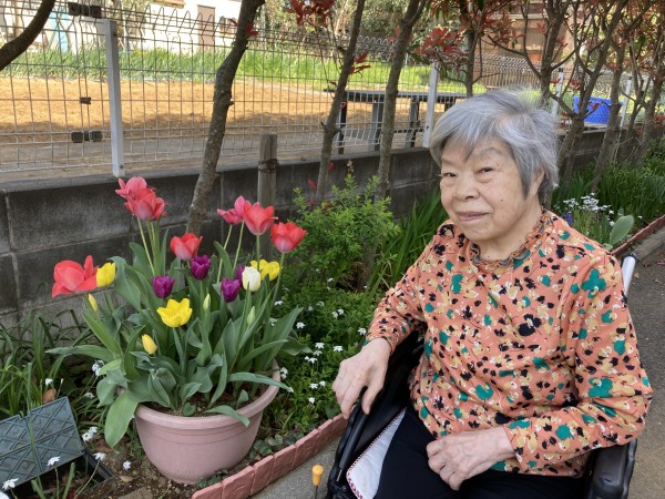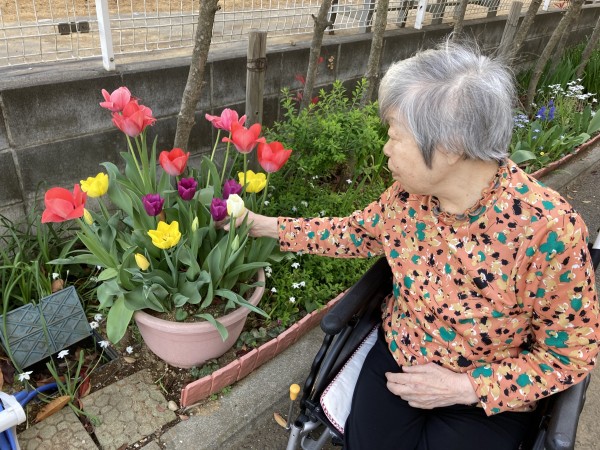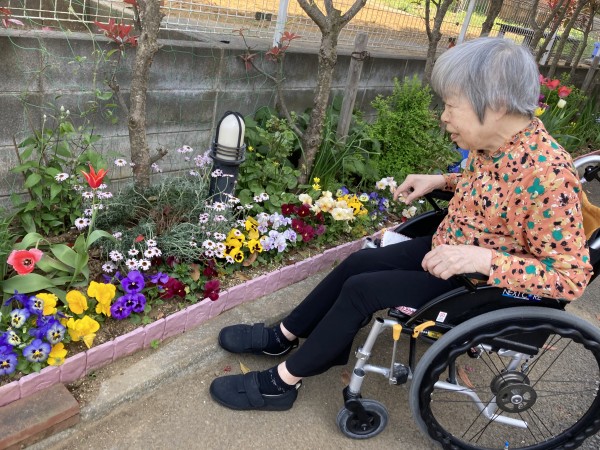 最初は「え~…いいわよ」と仰っていましたが花壇への方へ行くと「あ~暖かくて気持がいいわね」「きれいに咲いてるね!」と明るく話されてました。
