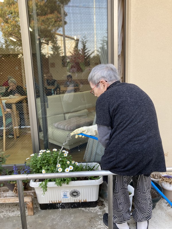 ホースの先を少しつぶして遠くの植物たちにもお水をあげています。