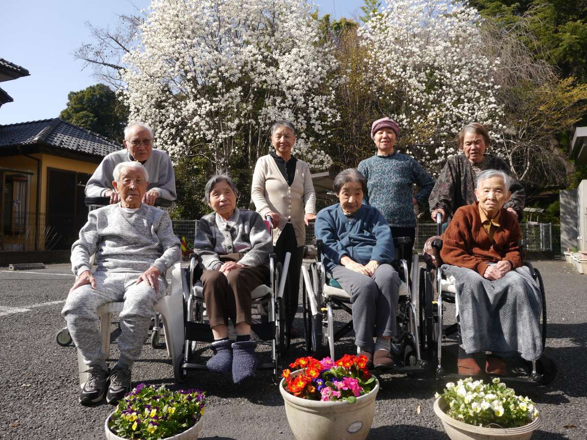 ご入居者様を外にお誘いし、集合写真を撮りました。「綺麗だね~」と自然と笑みがこぼれていました。