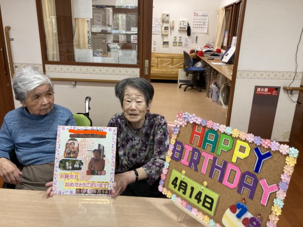 利用者様から利用者様へ色紙のプレゼントを恥ずかしそうに受け取られ、みんなでhappybirthdayを歌いお祝い!
