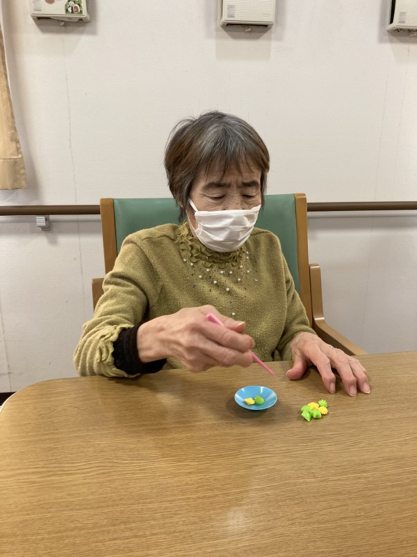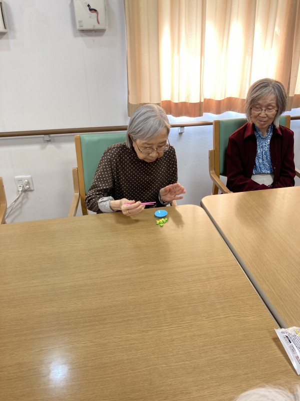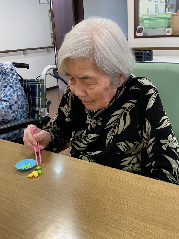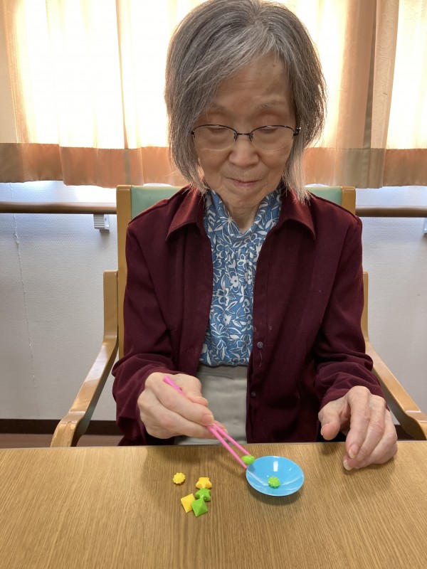 小さな箸のようなもので小さな物を挟んで移動させるゲームで手を細かく動かすことができ