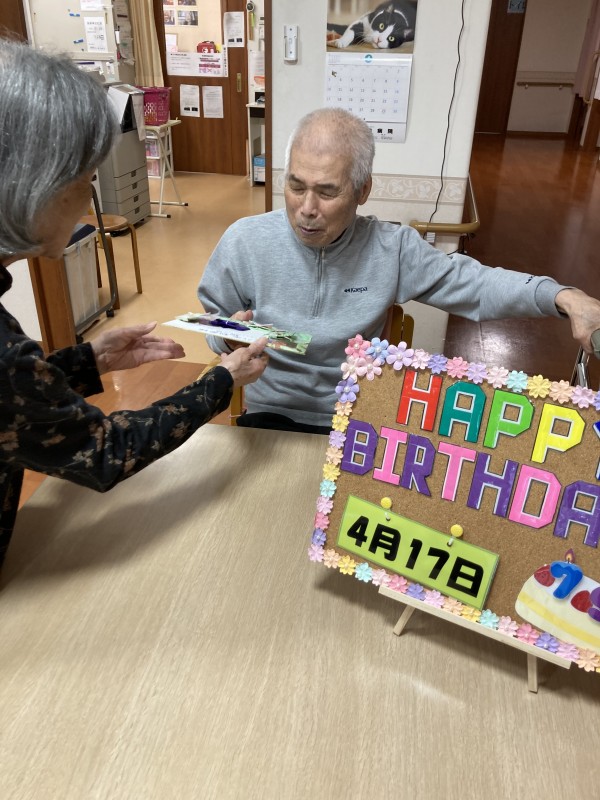 利用者様とスタッフみんなでhappybirthdayを歌い、写真を撮る時には満面の笑みです。