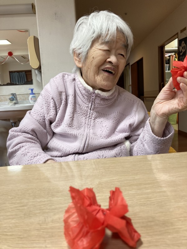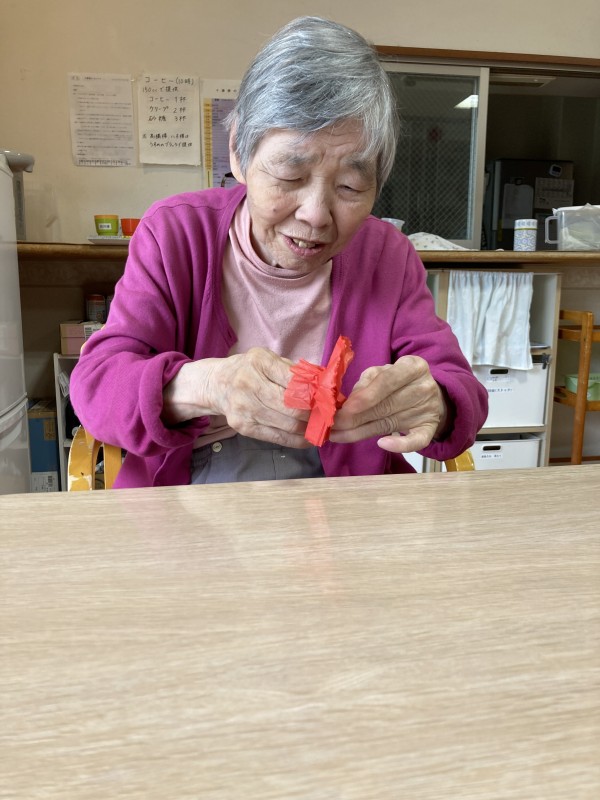 「昔は色が何色もあってもっと大きいの作ったわね!」「紙が薄くて難しいわね」と談笑し楽しく細かな作業をしてくれてます。