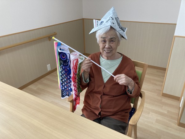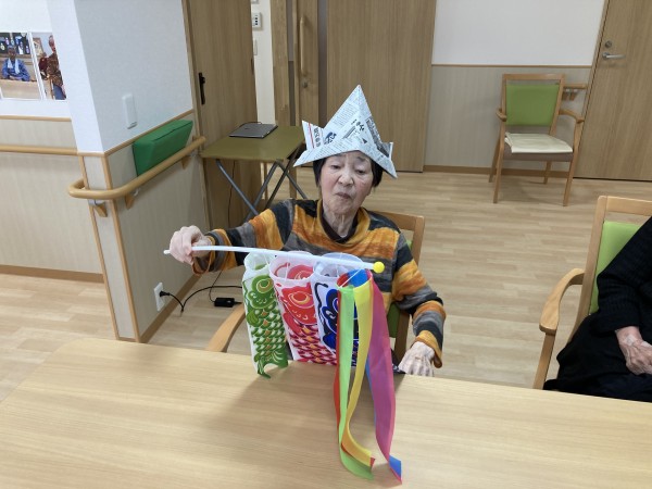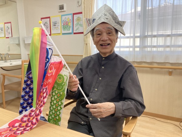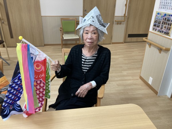 新聞紙の兜を作り、入居者様達に被って頂きました!
