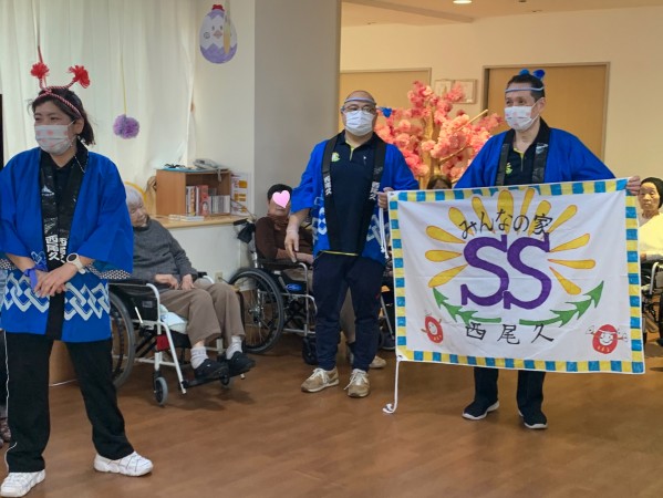 早川ケアスタッフがショートステイの旗を持ち