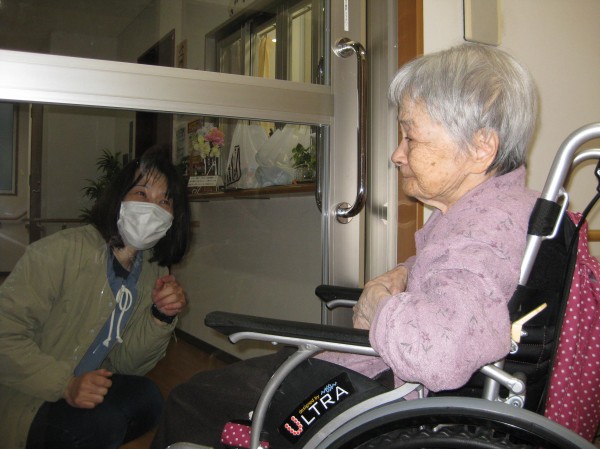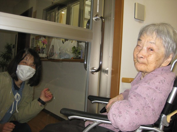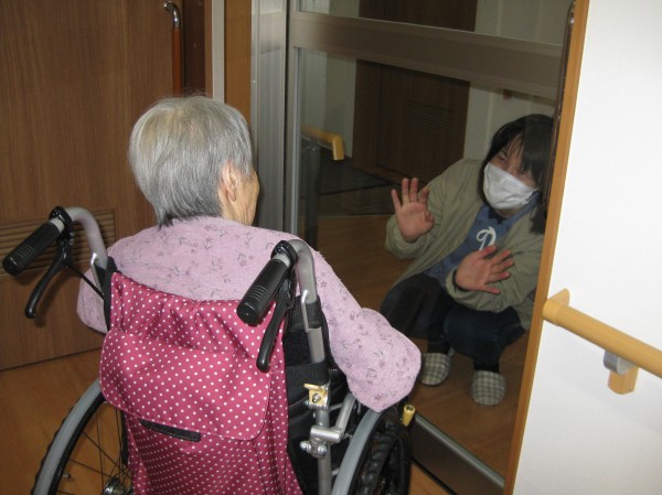 こんにちは!グループホームみんなの家・あきがせの介護ブログです!よろしくお願いいたします。おやつの差し入れをお持ちになられガラス越しにて面会をされたご様子です!!