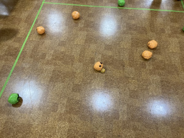 ルールは投げたお手玉にボールを投げてどちらがお手玉の近くで止められるかです。