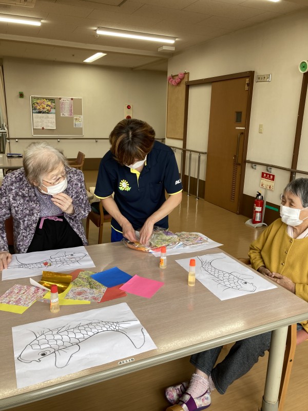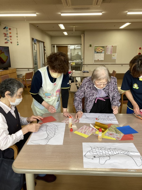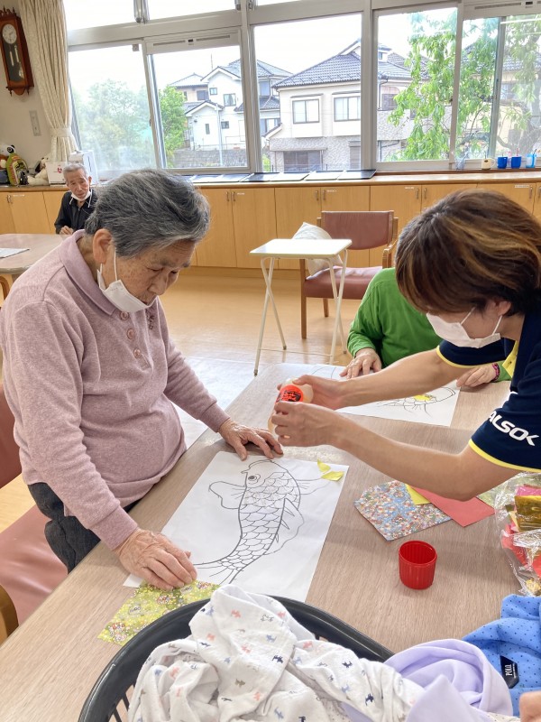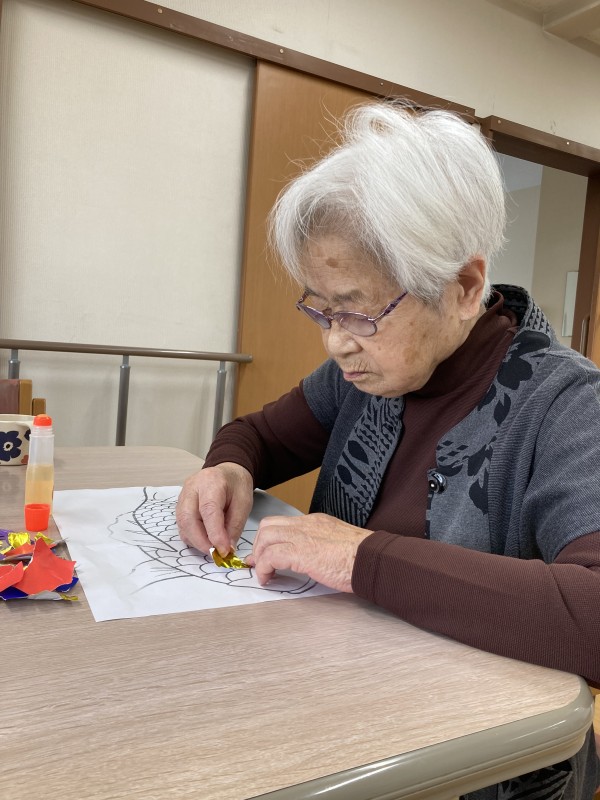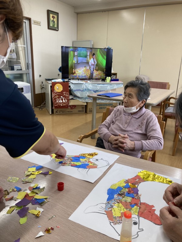 今日は職員と利用者様で力を合わせて何やらテーブルで作業中です。