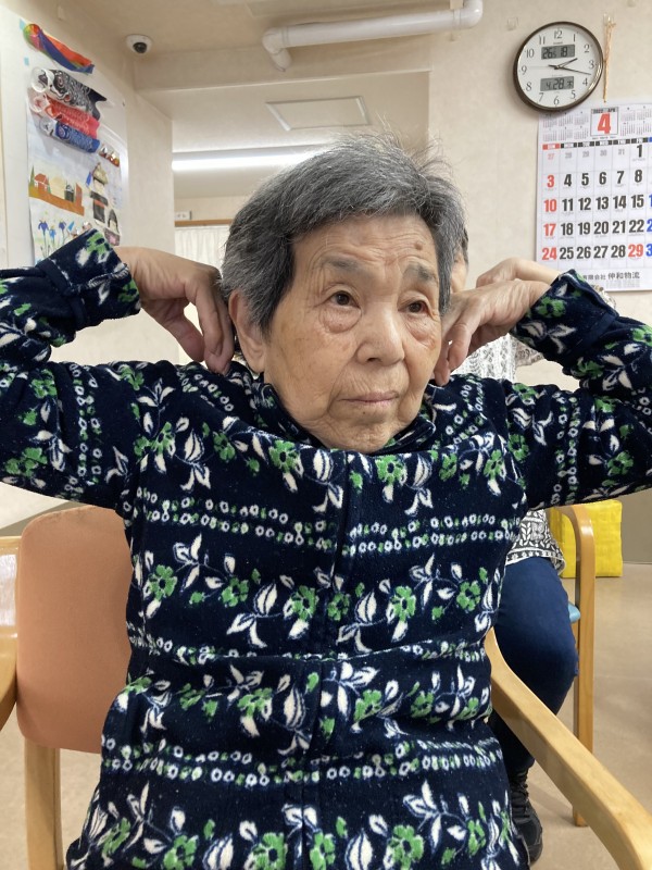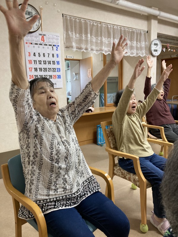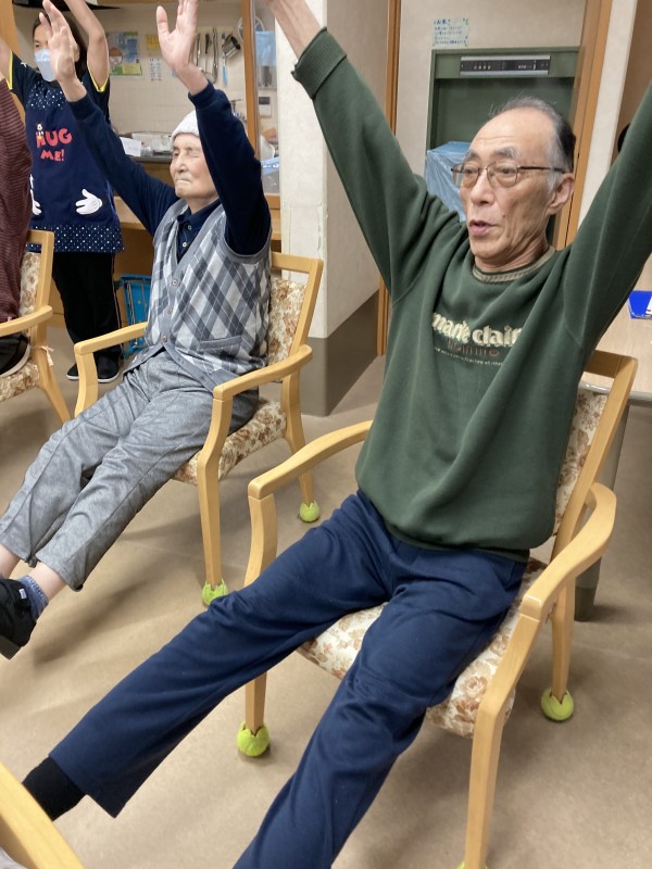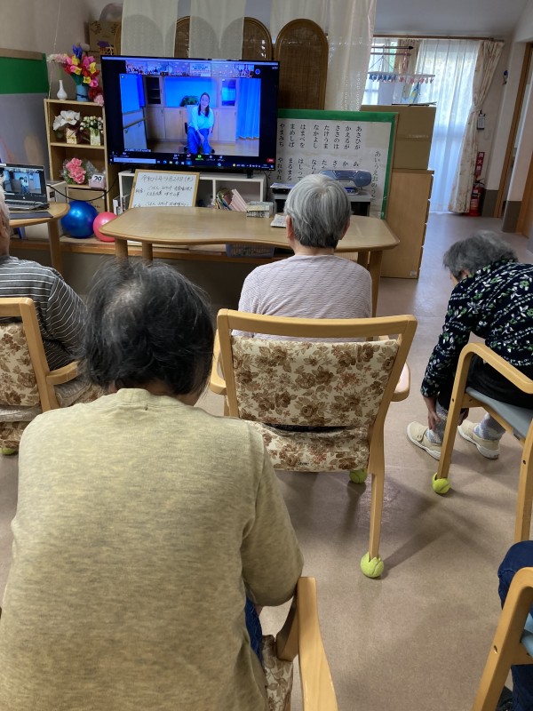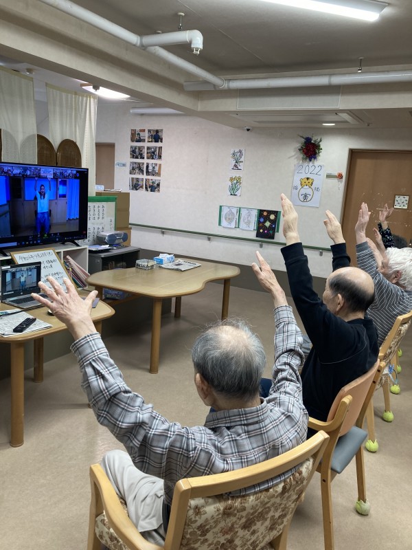 皆様テレビン画面のインストラクターの先生をまねて身体を動かして頂きました。
