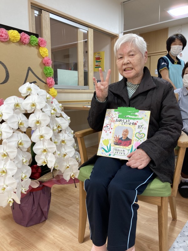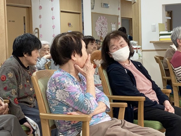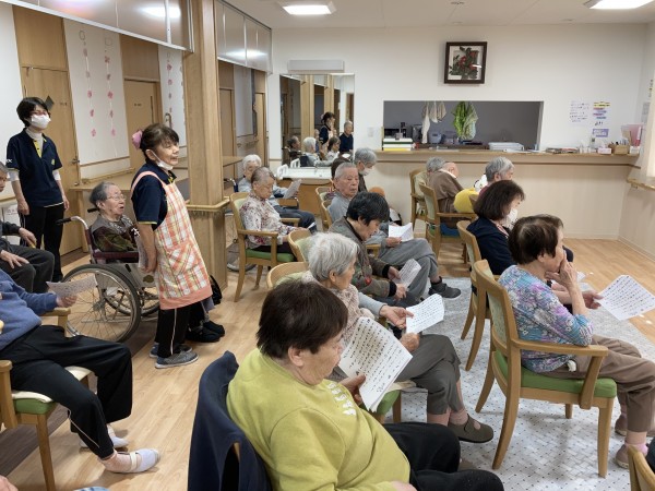 4月の誕生日会と、お花見に代わる花の会を開催しました。お誕生日を迎えられた利用者様は、皆さんからお祝いの歌を唄ってもらい、色紙をプレゼントすると、とても喜ばれていました。又、花の会では、花にちなんだ歌を皆さんで唄い、花からの連想ゲーム、なぞなぞなどを楽しまれました。連想ゲームやなぞなぞは、頭をフル回転し、一生懸命考え、大きな声で答えてくれました。